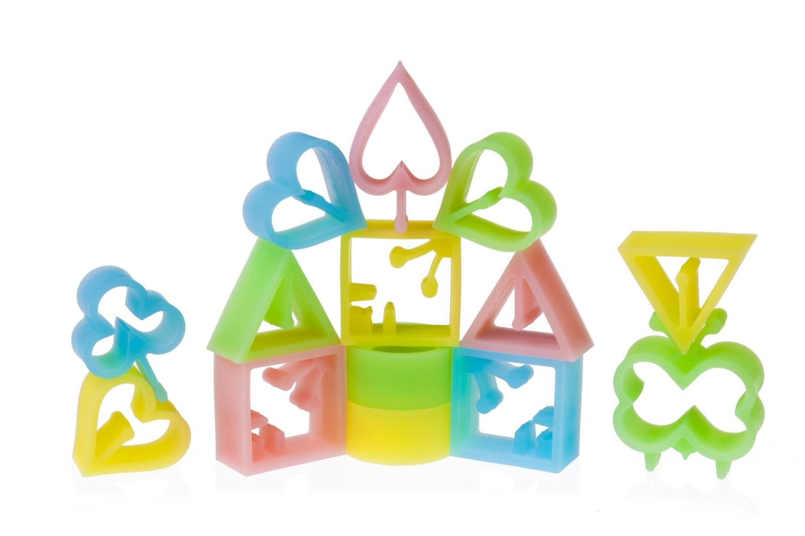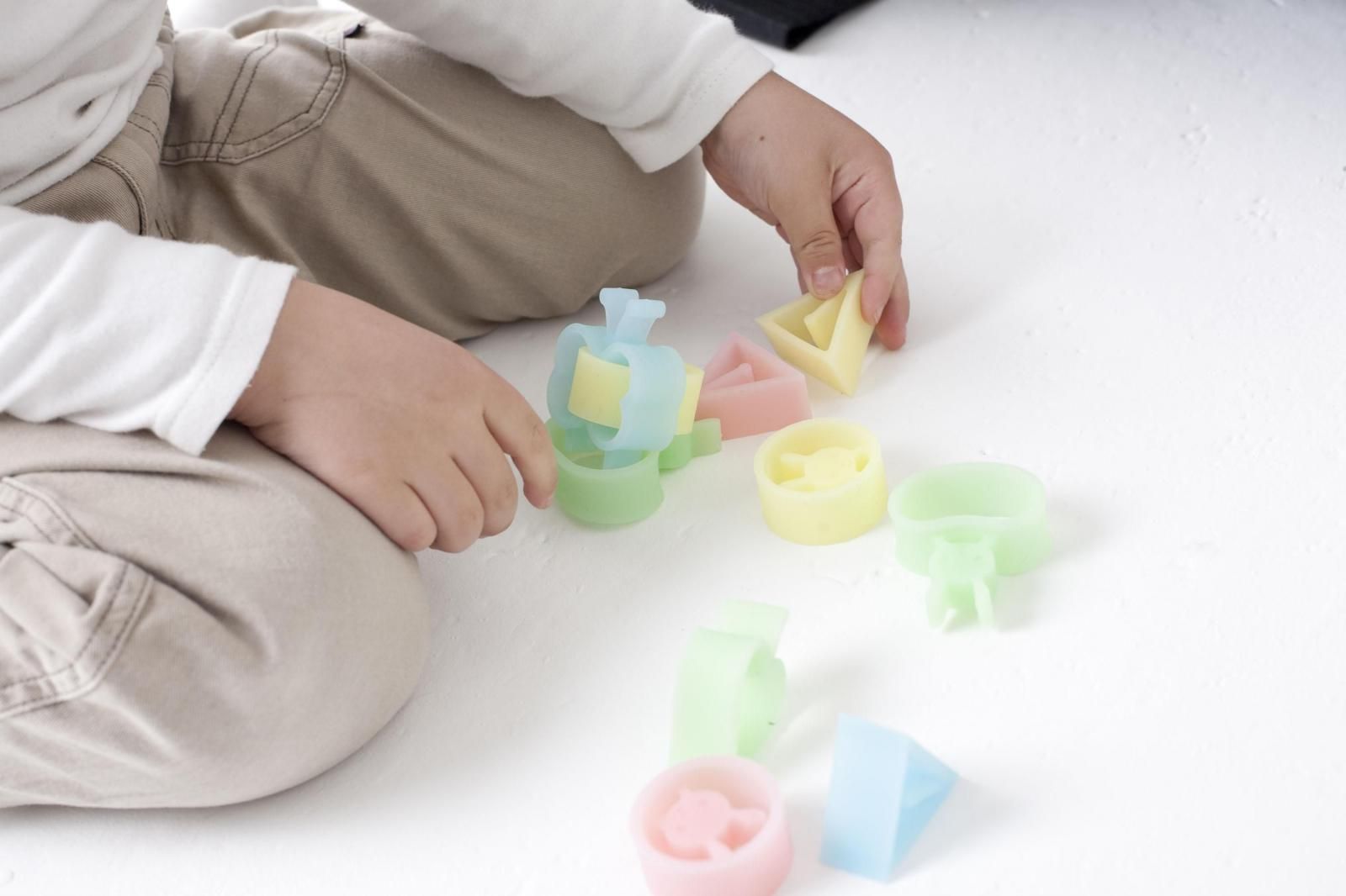 成長にあわせて、ひっくりかえして、おさえて、並べて、積んでなど様々な遊びができ、無数の形をイメージし遊ぶことで、心身の発達に役立つブロック玩具。